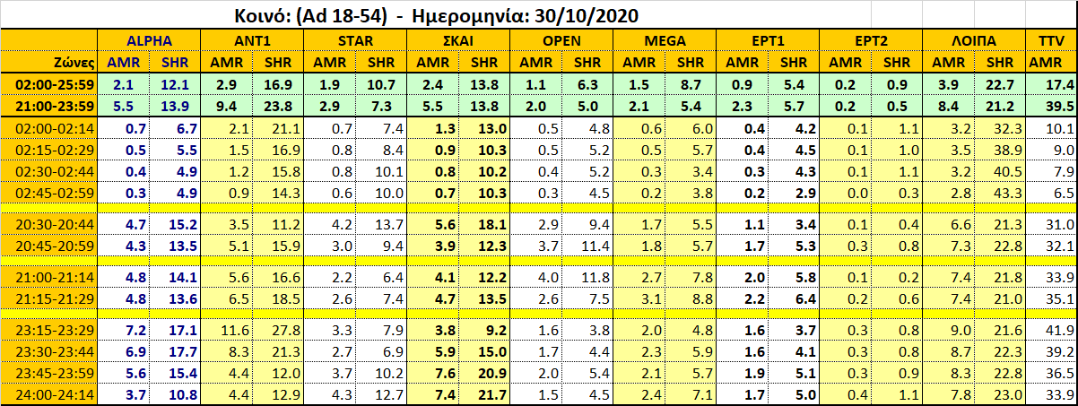 Η στήλη ΛΟΙΠΑ / SHARE, δείχνει αυτό ακριβώς. Το μερίδιο τηλεθέασης μίας τυχαίας ημέρας που απορροφούν τα Συνδρομητικά, Περιφερειακά, NETFLIX και λοιπές πλατφόρμες και είναι από 20% έως και 40% του συνόλου σε κάποιες χρονικές ζώνες.
